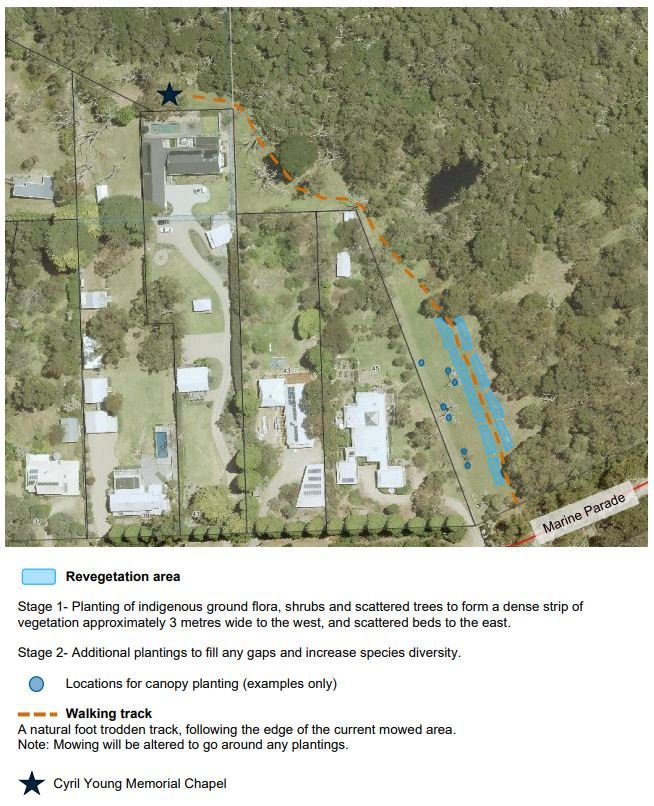 Our diagram shows a pathway and plantings proposed for the first part of track from Marine Parade by Council on 16/3/2022. The proposal includes planting 450 indigenous plants to be planted by the Mornington Peninsula Koala Conservation Group (MPKCG) and our own crew once we are into the planting season. Council will do the necessary site preparation work in advance.