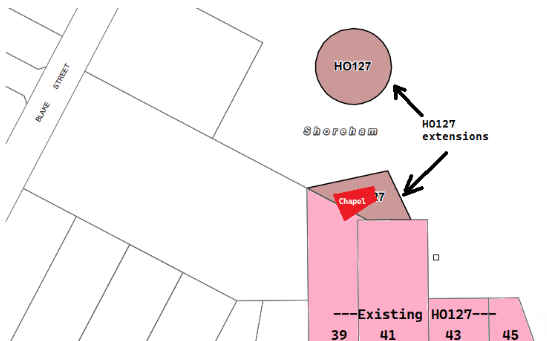 For reasons that escape us, only the part of the Chapel in private land was originally included in the Heritage Overlay HO127. The overlay currently applies to only the private land which houses or housed Camp Buxton buildings. The northern end of those properties on Marine Parade is shown in pink in our diagram, The proposed extensions are shown in brown with the actual chapel shown in red.